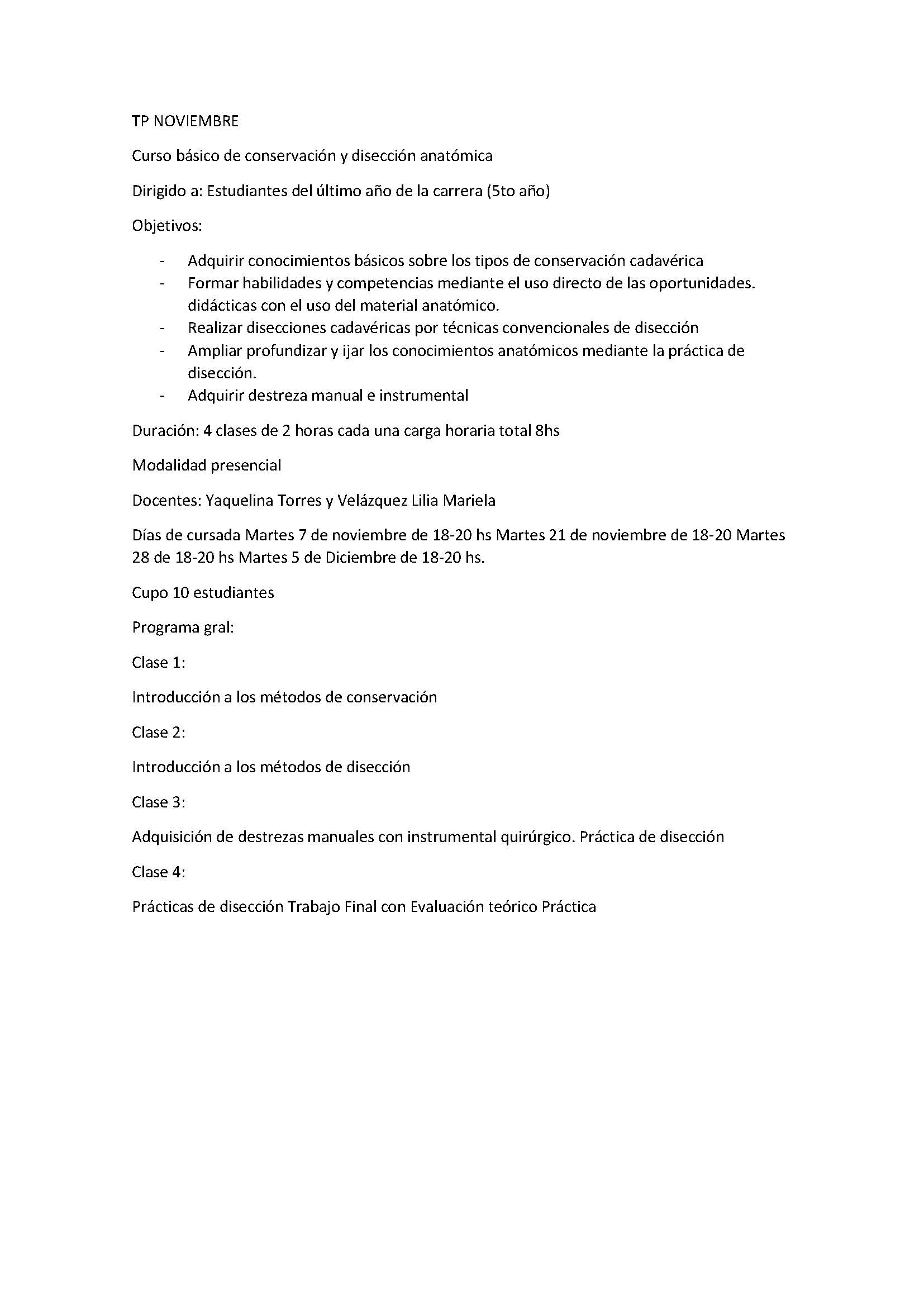 El objetivo es adquirir conocimientos básicos sobre los tipos de conservación cadavérica; formar habilidades y competencias mediante el uso directo de las oportunidades didácticas con el uso del material anatómico; realizar disecciones cadavéricas por técnicas convencionales de disección; ampliar profundizar y fijar los conocimientos anatómicos mediante la práctica de disección y adquirir destreza manual e instrumental.
